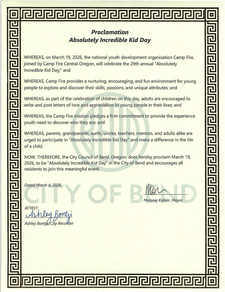 Bend, Ore., March 18, 2026 — The City of Bend is officially proclaiming Thursday, March 19 as Absolutely Incredible Kid Day® (aka #KidDay), recognizing the importance of celebrating and lifting up youth throughout the community.
