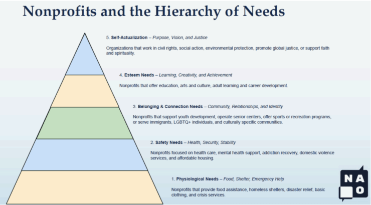 Per NAO research, the vast majority of federal funding and large-scale nonprofit services are now laser-focused on level one: physiological survival. Because of massive cuts in federal funding for even the most essential services, nonprofits are now exhausted just trying to fill those basic gaps. Foundations have followed suit, shifting their focus away from youth development and prevention just to keep people fed and housed.