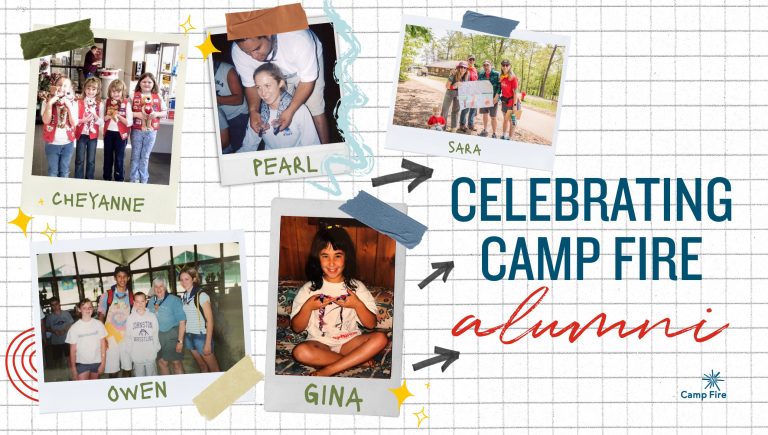 Graphic that says celebrate Camp Fire alumni and shows a few pictures of them.