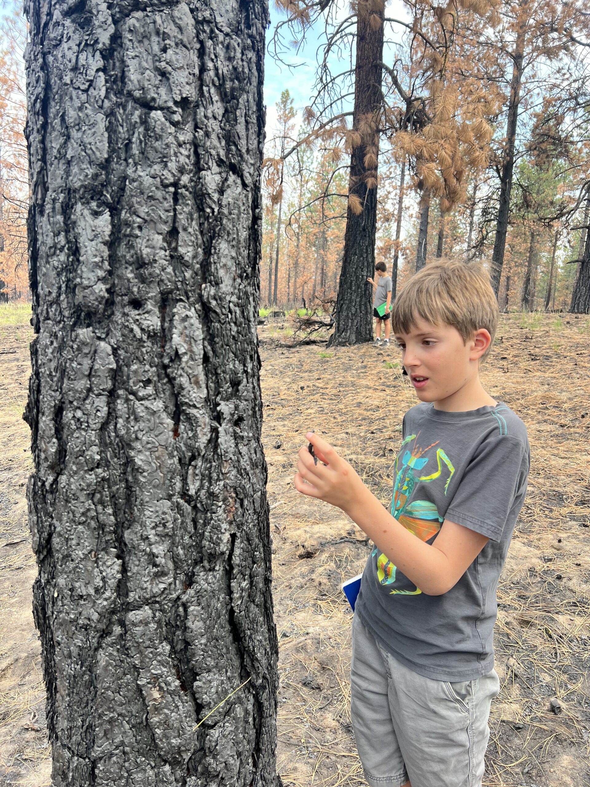 Boy examines a tree up close in the woods.