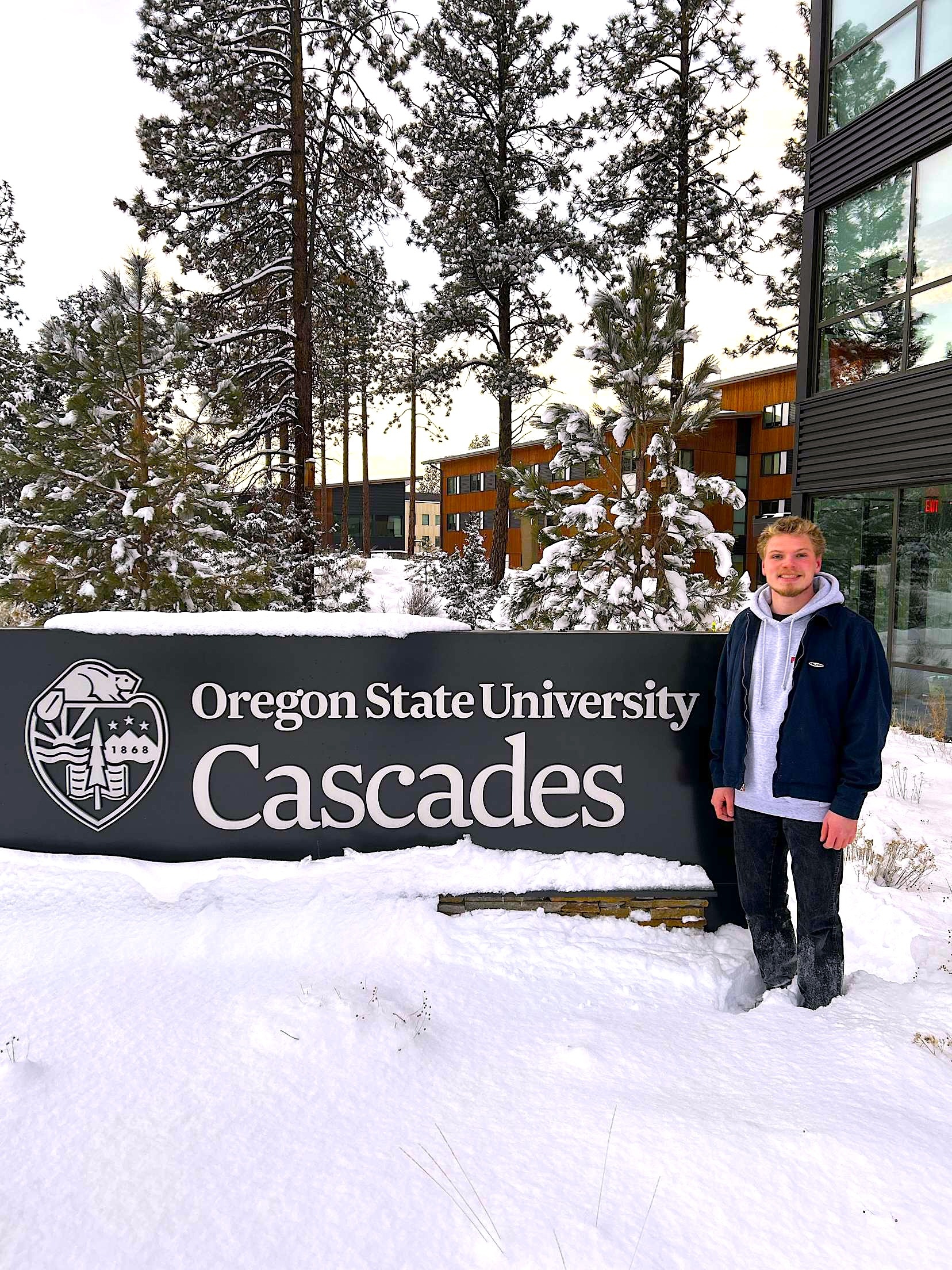 Harrison Feist standing in front of OSU-Cascades sign.