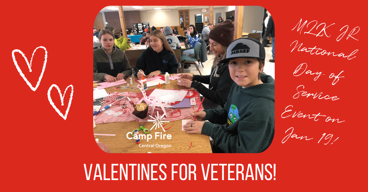Camp Fire Central Oregon invites the community to honor MLK Jr. National Day of Service by creating heartfelt Valentine’s cards for U.S. veterans. All ages are welcome to drop in on Monday morning, January 19, at Bend Church-United Methodist to craft cards that will be delivered to the regional veterans hospital on Valentine’s Day. Materials are provided, and participants will also hear from a local veteran, our guest speaker.